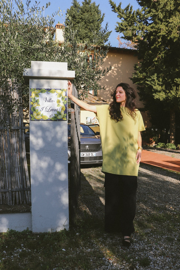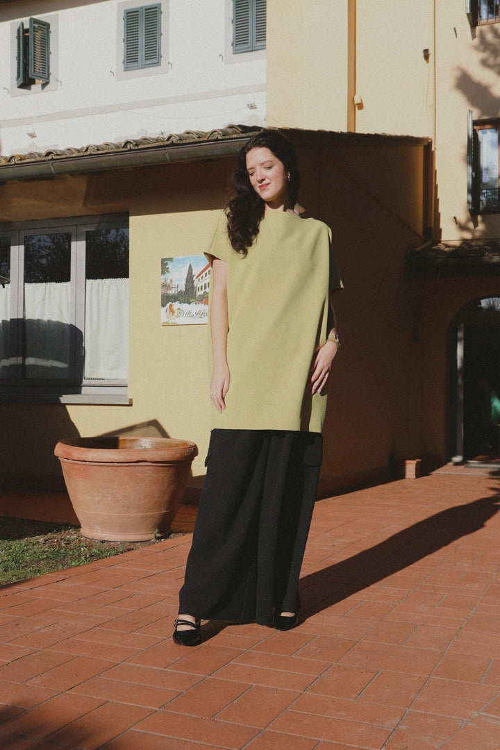 a favorite of our customers on the shorter side of things! the kaarem angle open back dress is a an oversized above the knee, dolman cut dress. it is constructed with two pieces of fabric and a natural drape creating the open back feature with a hand braided button loop and blind stitch finishes. it's great layered under a sheer duster or over some tapered trousers.