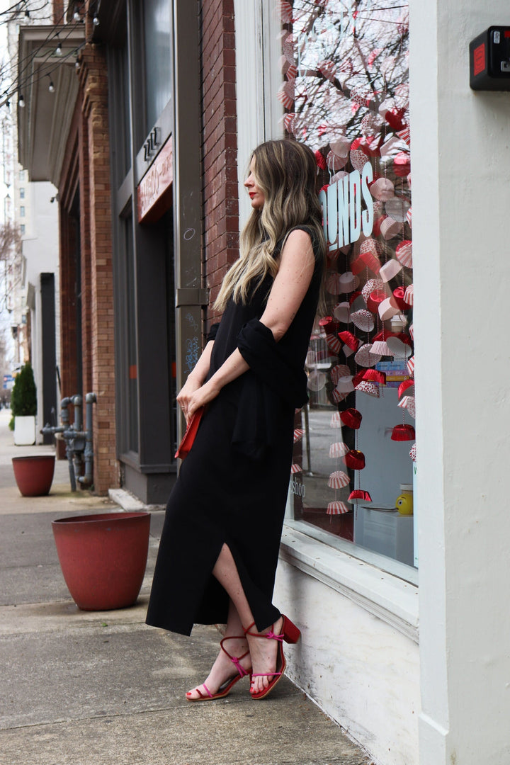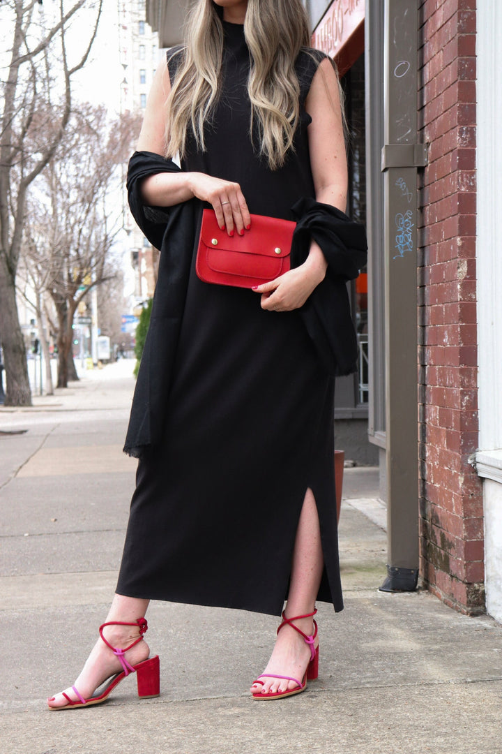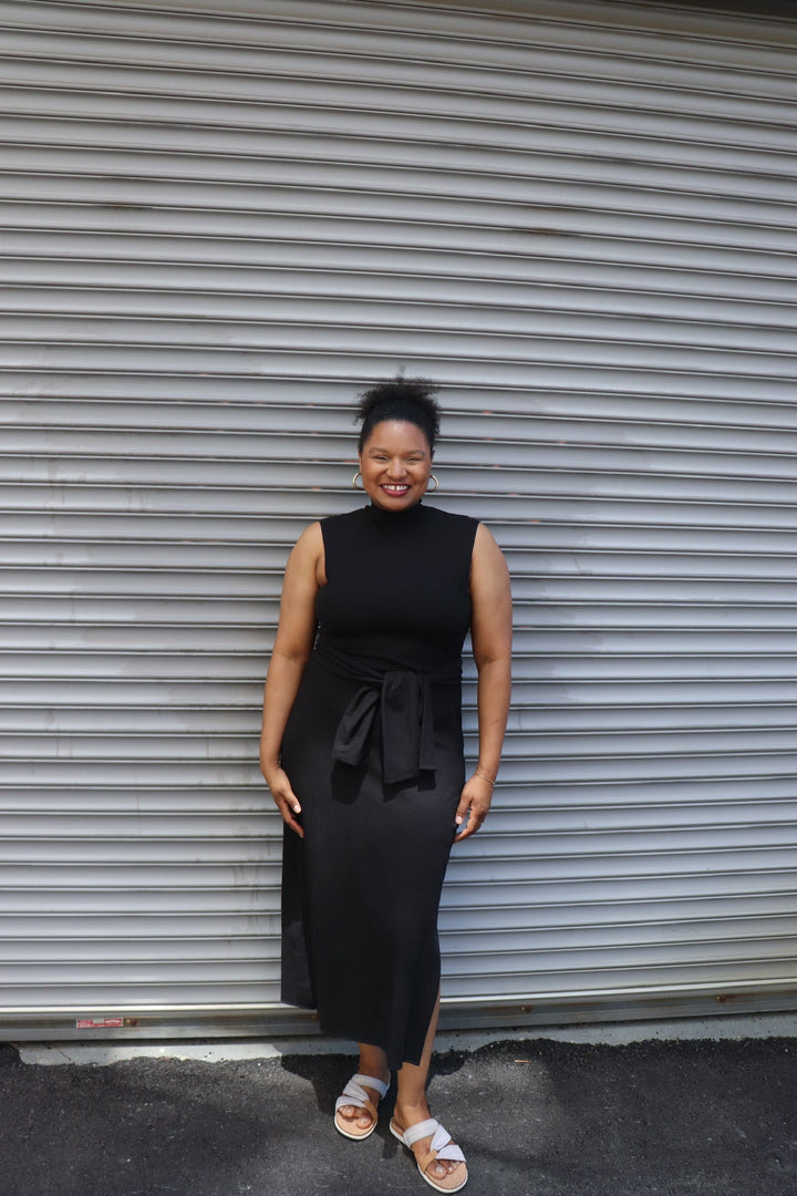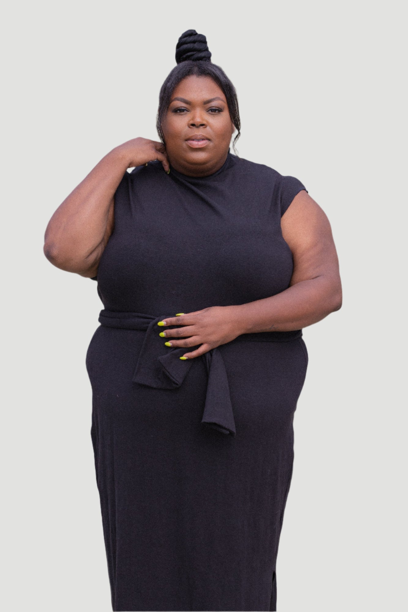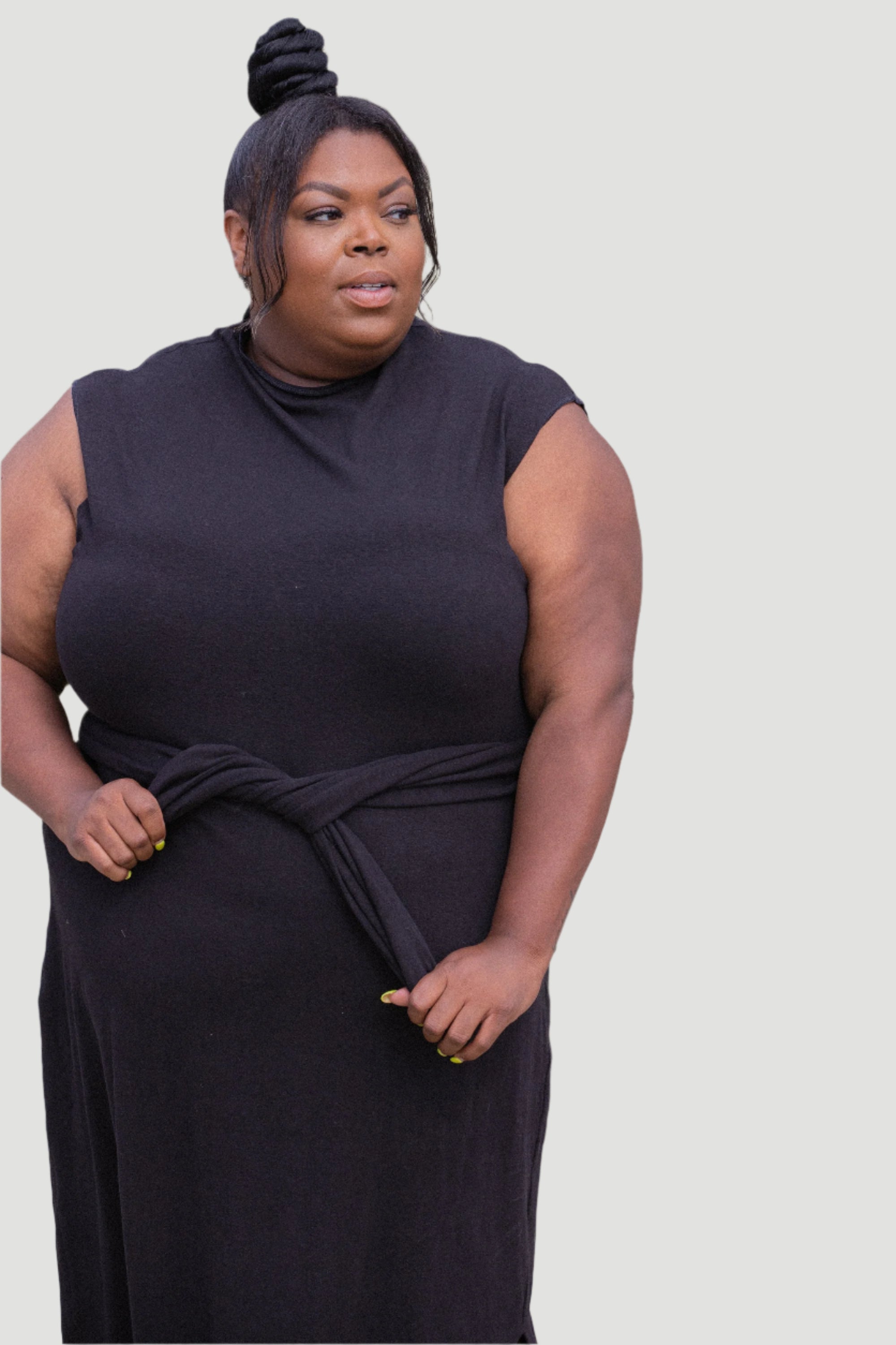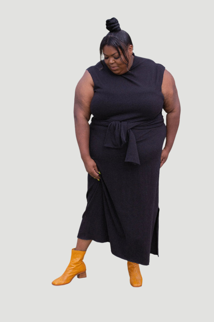 CUSTOMER FAVORITE! the vincetta black cotton hemp column dress is a form fitted dress with a raw edge high draped neck, armholes, and clean hemline. it features a removable cotton hemp adjustable belt.