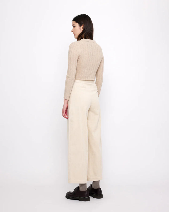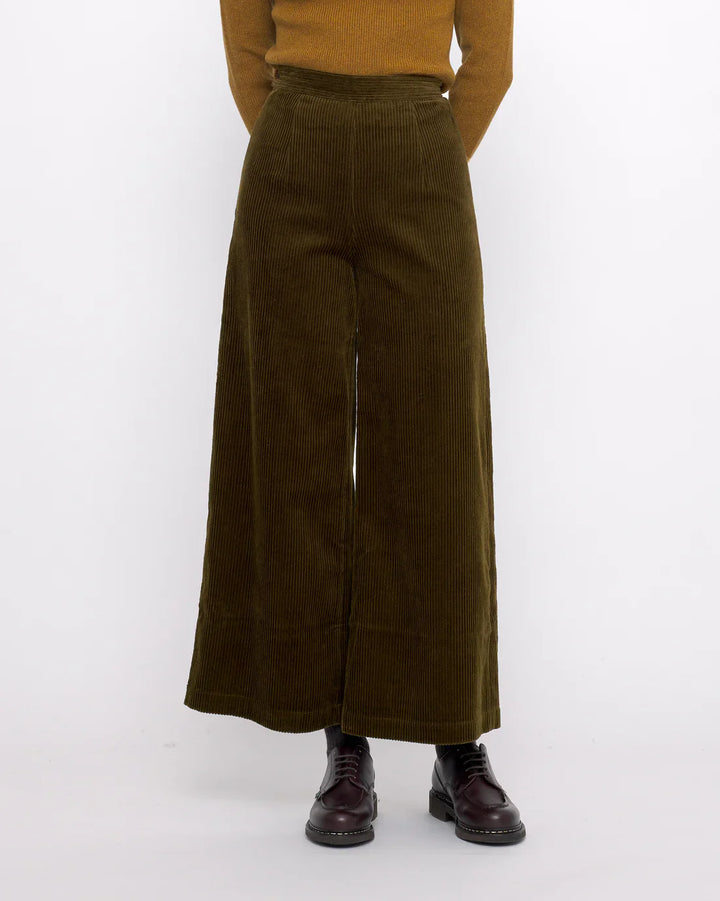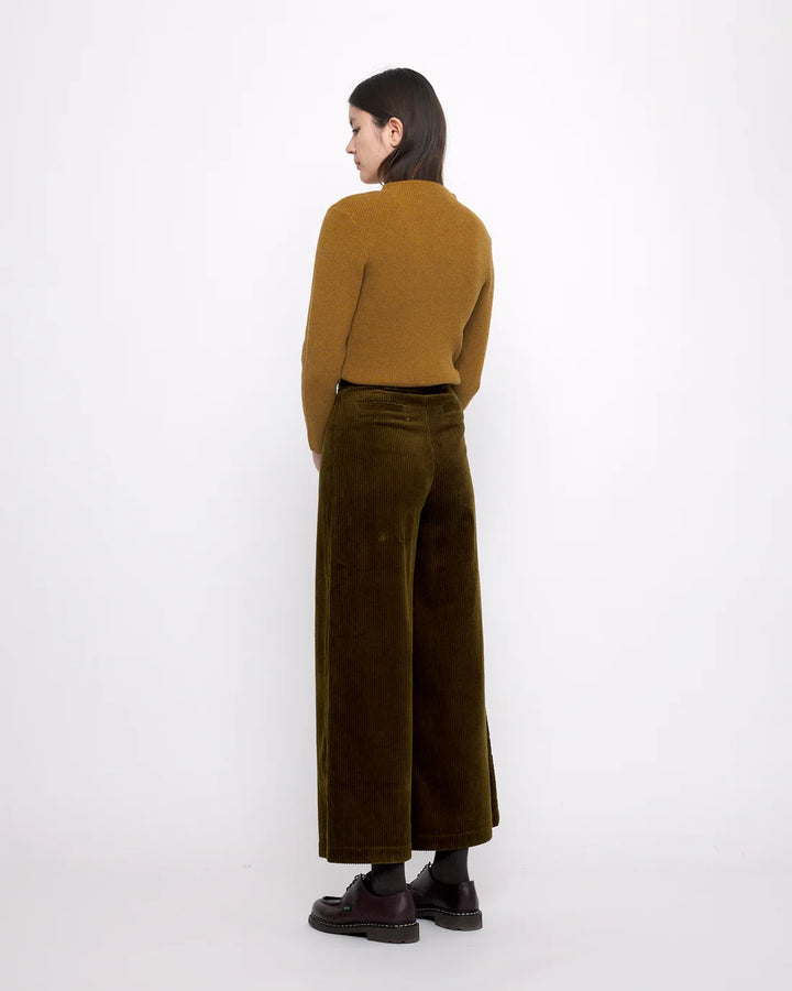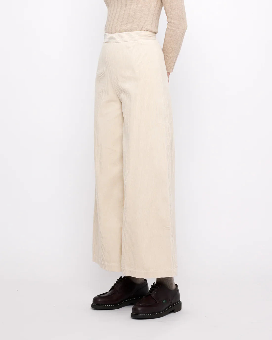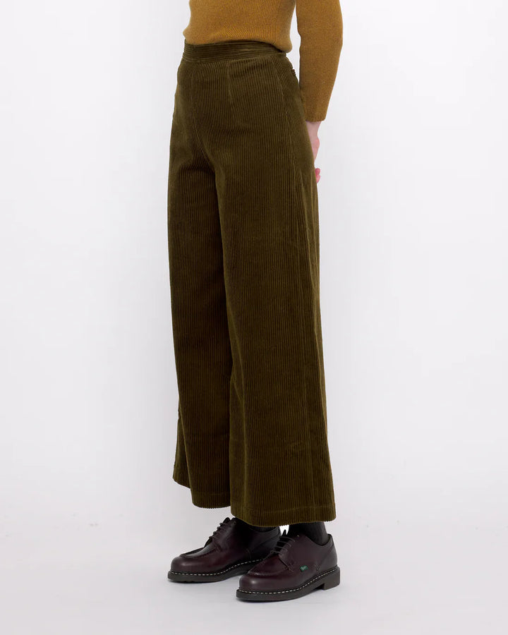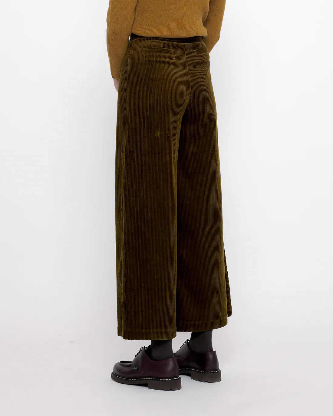 the 7115 by szeki classic wide-legged trouser is a refined high-waisted, wide-legged trouser made from a plush, mid-wale corduroy fabric. they feature a side-zipper with a single button closure, a clean, minimalistic look at the hips and two flat back pockets.