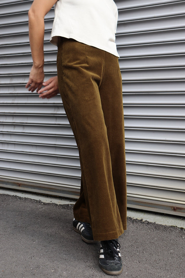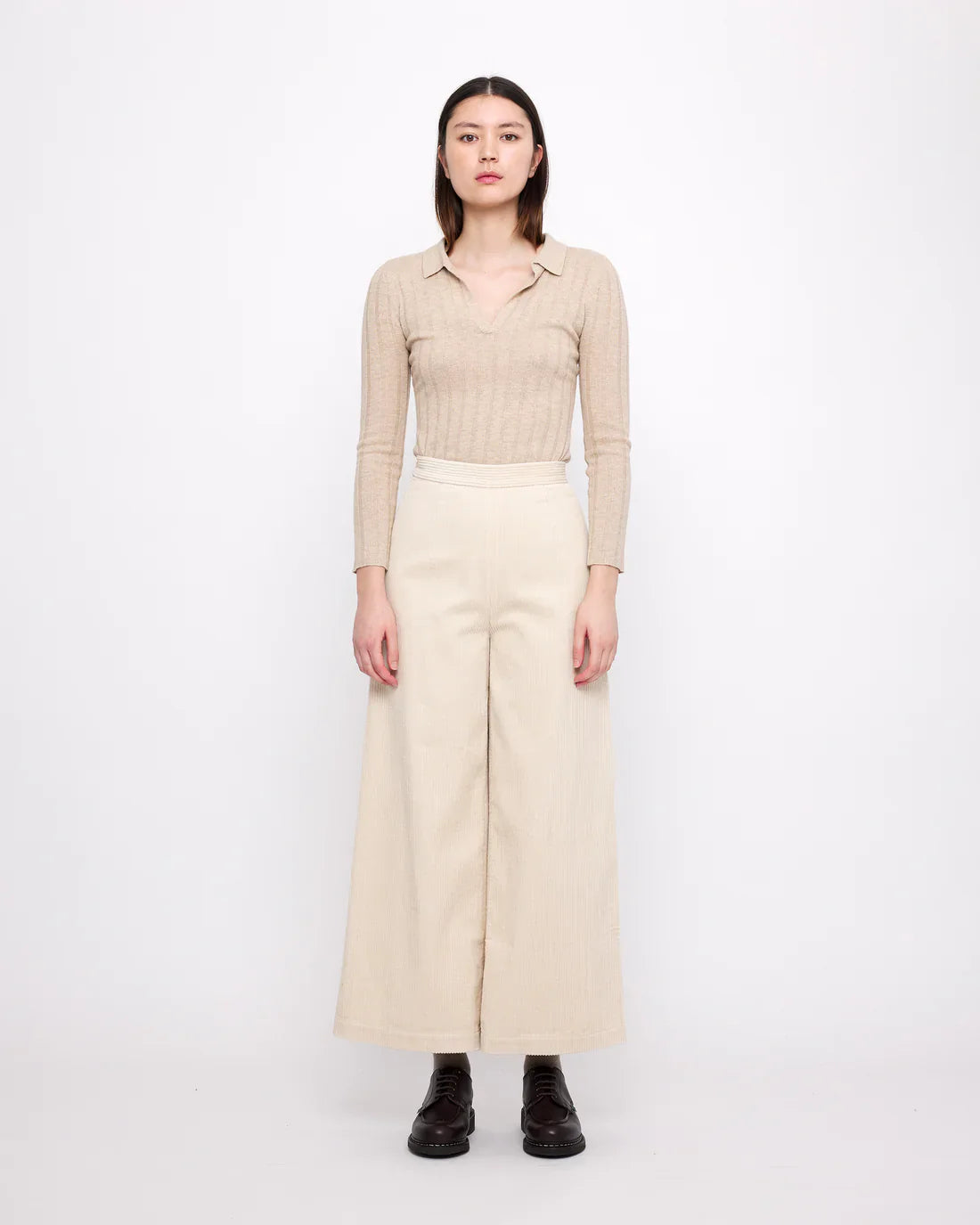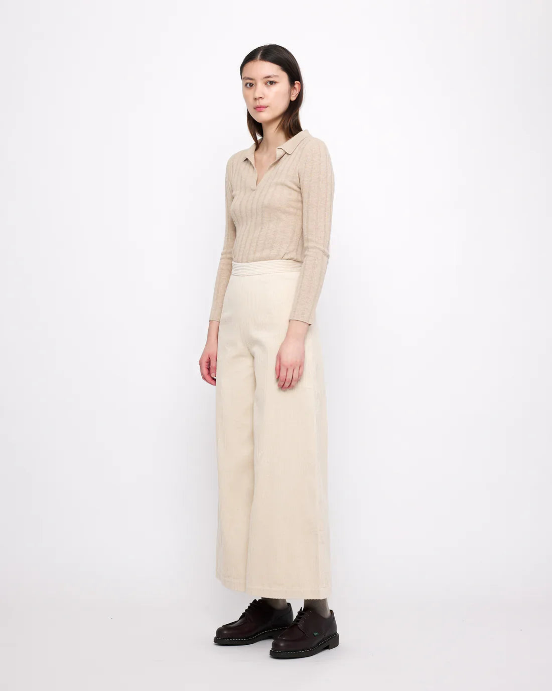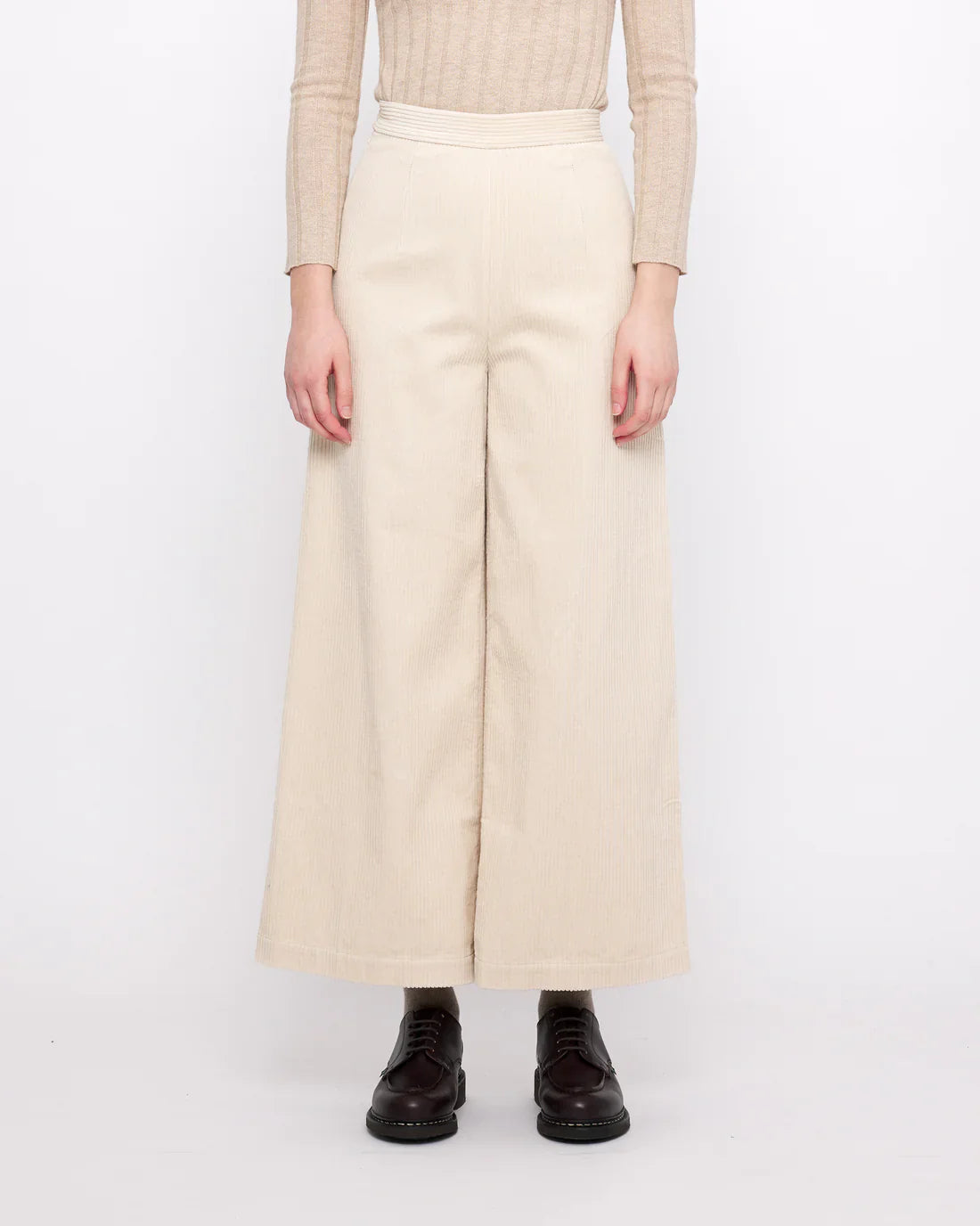 the 7115 by szeki classic wide-legged trouser is a refined high-waisted, wide-legged trouser made from a plush, mid-wale corduroy fabric. they feature a side-zipper with a single button closure, a clean, minimalistic look at the hips and two flat back pockets.