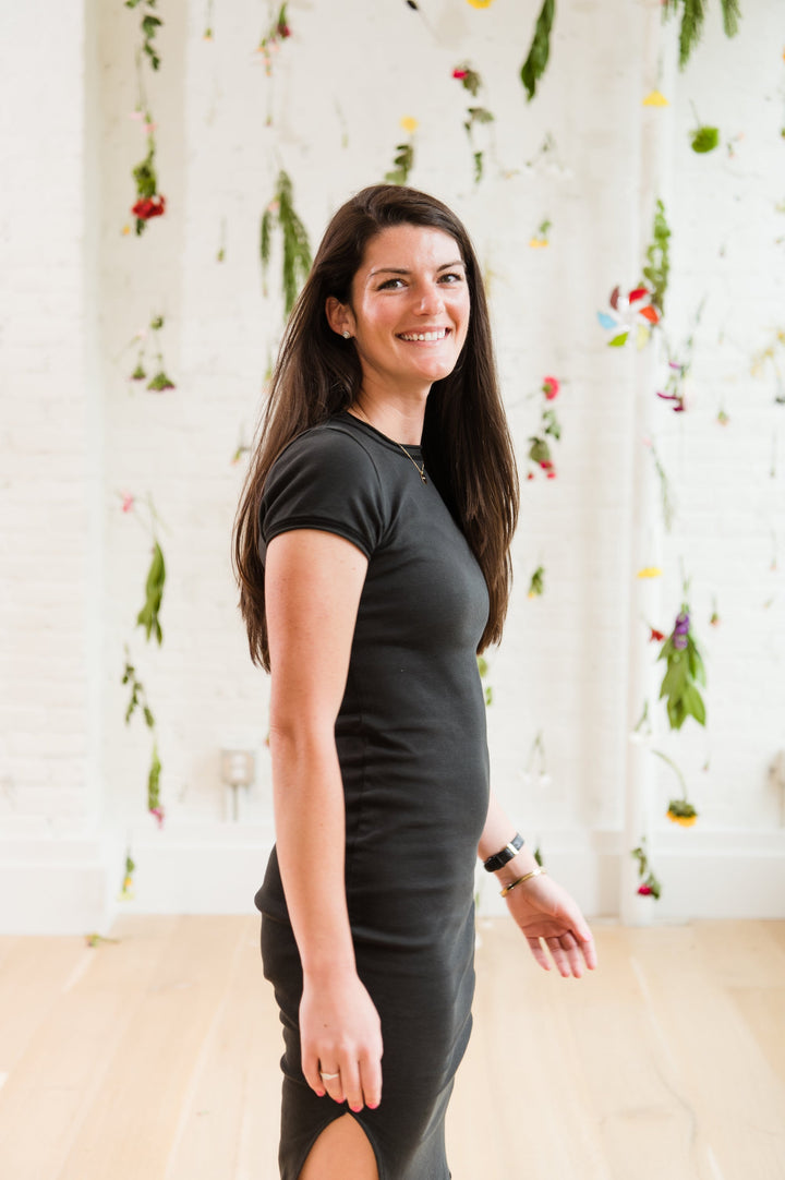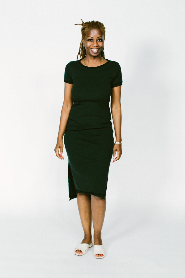 our team's consensus closet staple. the alabama chanin essential rib dress is a machine-sewn, flattering, straight silhouette with a slight train in the back and side slits for ease of movement. with its slim fit and rounded neckline that is not too low or too high, this style has a casual and comfortable, yet tailored look.