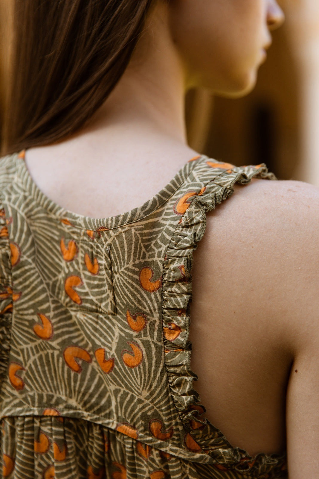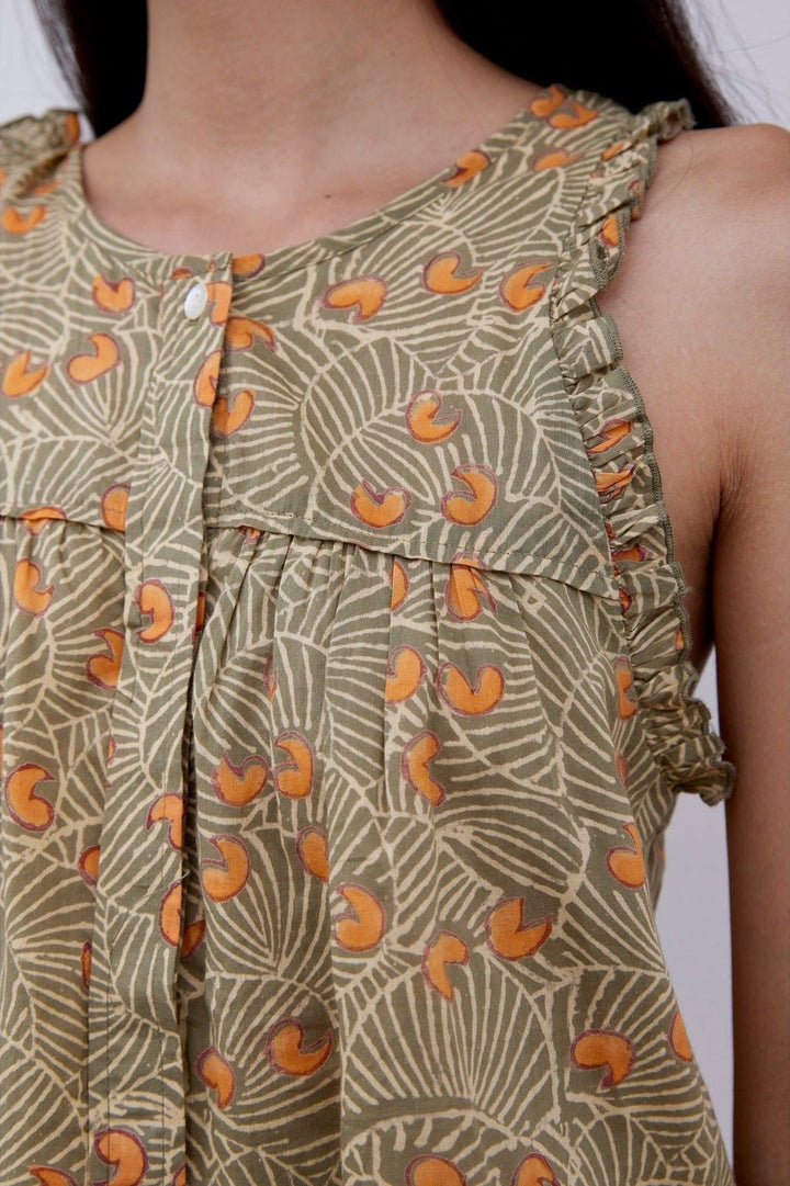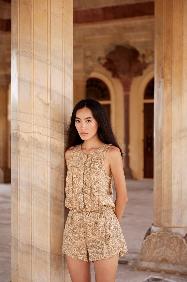 This romper showcases a classic Koloman Moser print, a tribute to the Vienna Secession art movement, bringing a touch of historical elegance to your wardrobe. The design is brought to life on soft cotton crepe using hand-carved wooden blocks dipped in vibrant dyes, a process that results in a truly unique and captivating piece of clothing. At CQC LA, we believe in the beauty of small-batch production. This process ensures the quality of each piece and means that each item carries a touch of the artisan's hand. Please note that due to the handcrafted nature of our clothing, slight variations in design and color are to be expected and celebrated." - 100% crepe cotton - Cotton lining - Made in India - Ships from California