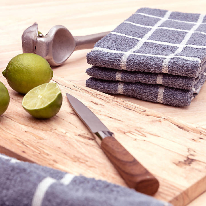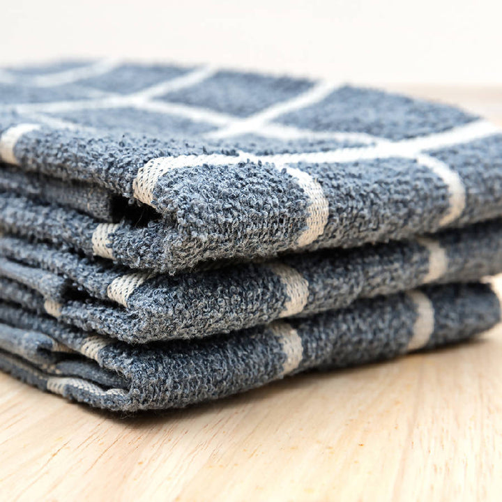 These kitchen towels and dishcloths are made with a terry wave for super absorbency and durability. Ecru and blue denim color. The MEEMA tea towel set is ideal for kitchens and bathrooms alike. 100% cotton (80% upcycled).