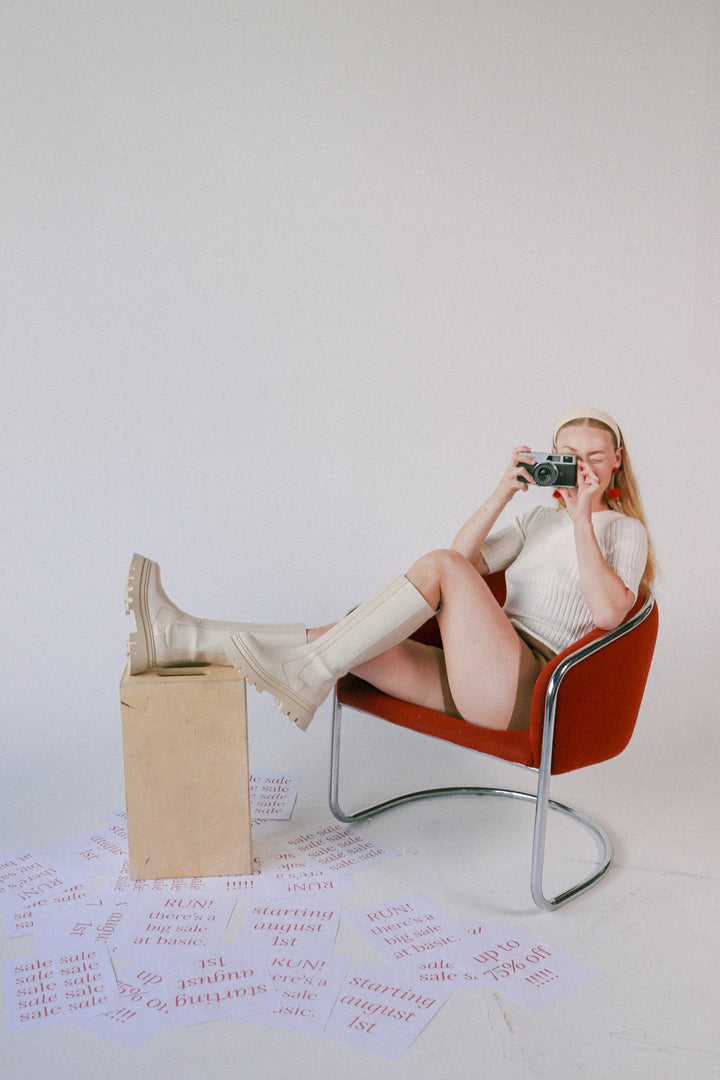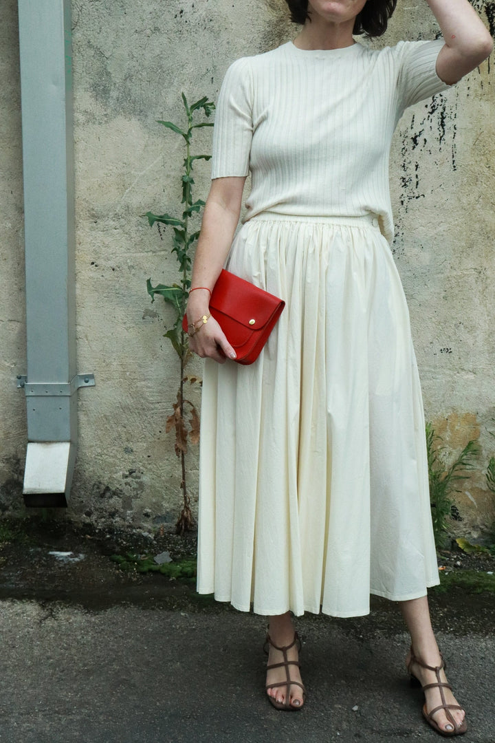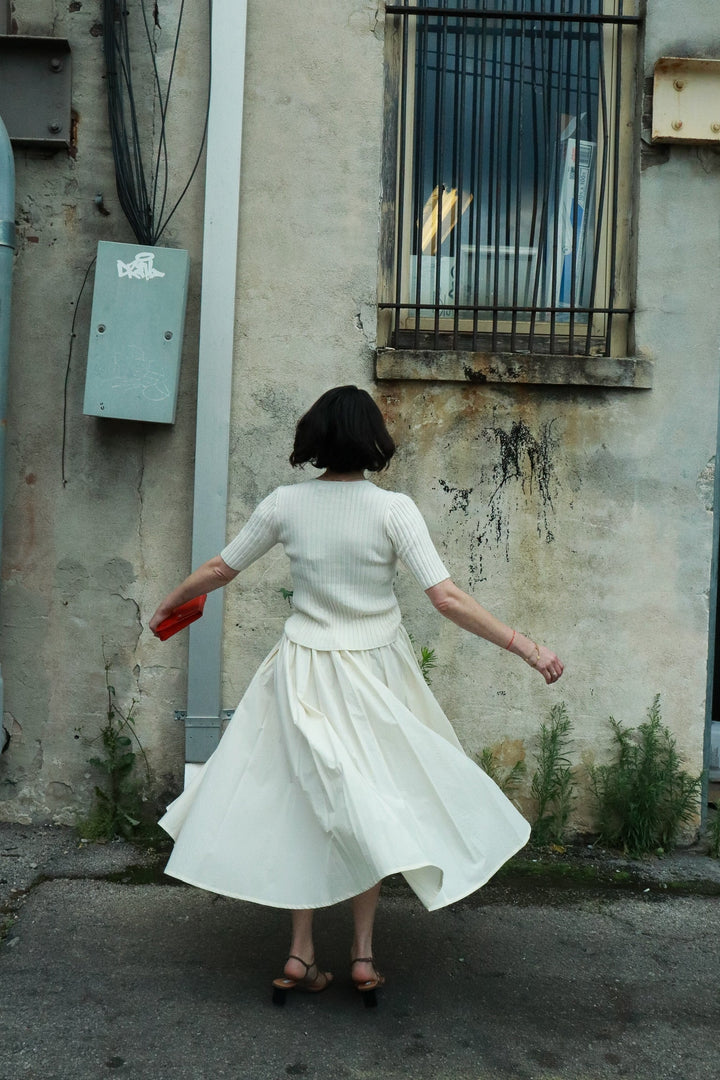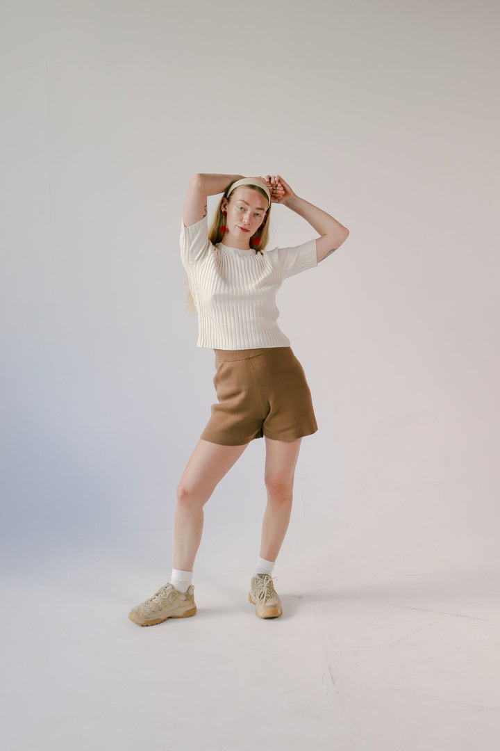 the mid-sleeves ribbed top is 55% organic cotton + 35% tencel + 10% kapok, and it runs large. for a snug fit, size down. we recommend gentle wash + lay flat to dry. do not dry clean.