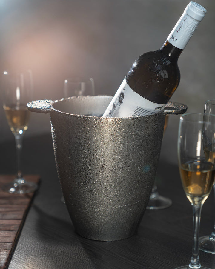 This bucket looks cool and acts even cooler. Designed to hold a standard 750 ml bottle of favorite wine or champagne safely on ice, this chiller is at home on the deck or in the dining room. Smooth tab handles come in handy when the party heads indoors, and provide a visual contrast to the piece’s textured exterior. Also available in an antique brass finish.