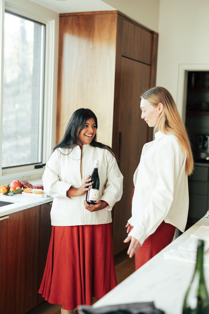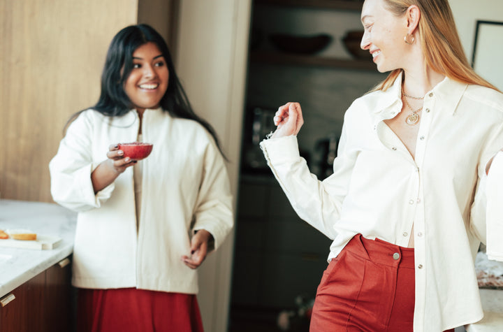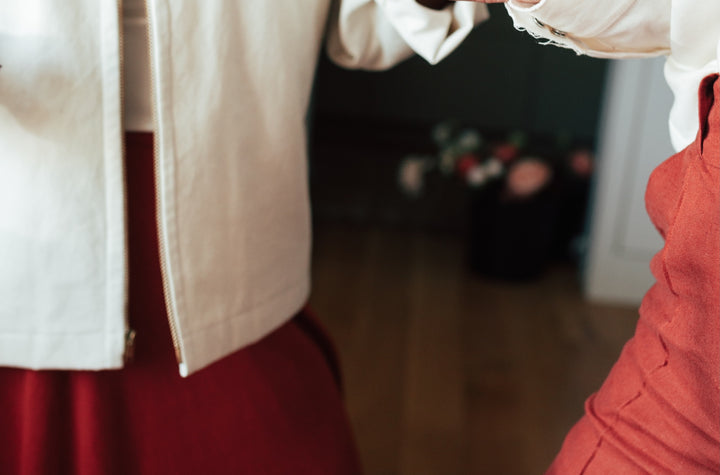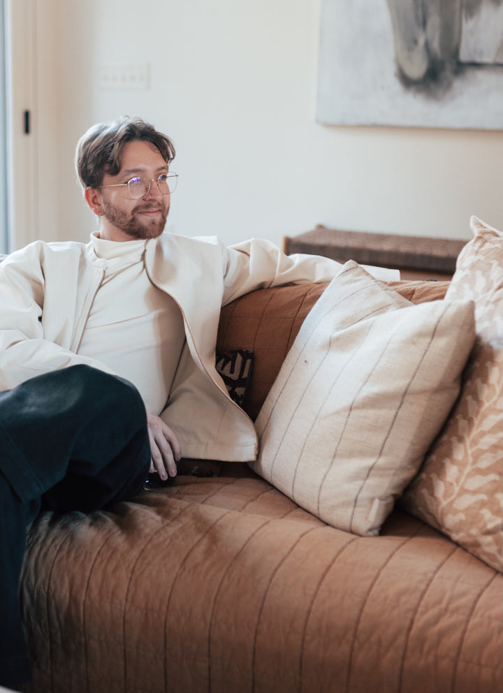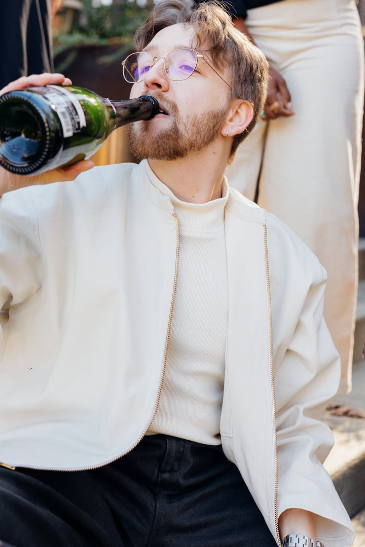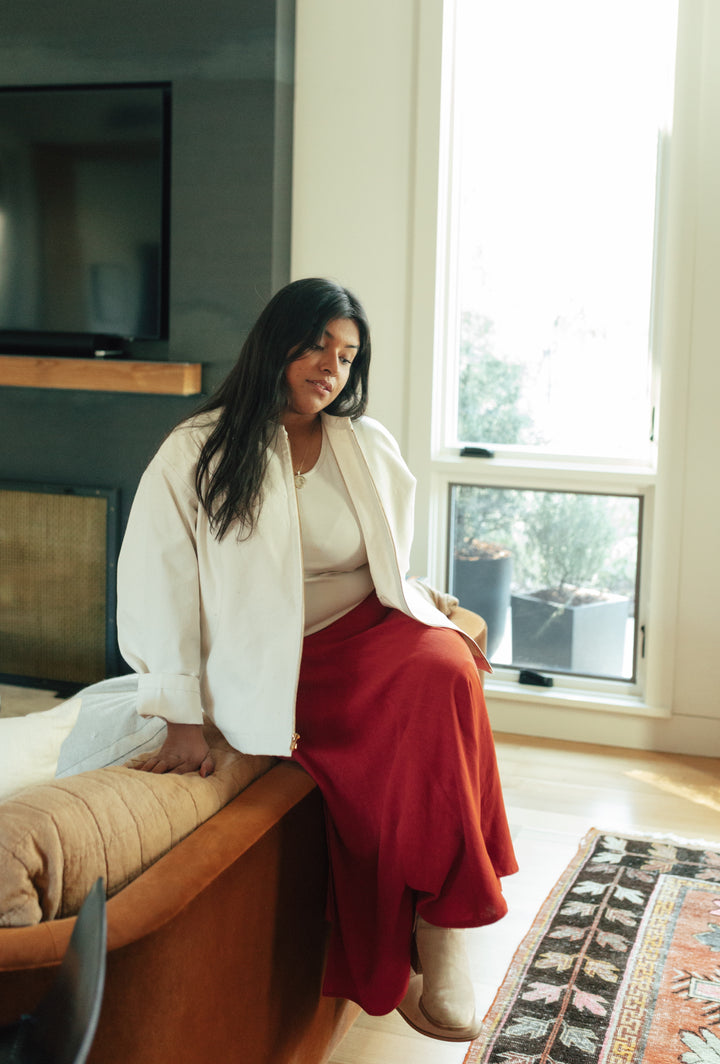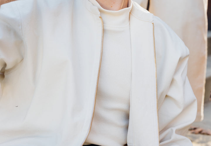 The Noah Bomber can be customized from colorway to fabric to sleeve or hem-length to suit your brand needs. Noah is wearing our Size One sampled in a mid-weight organic cotton canvas with brass hardware.