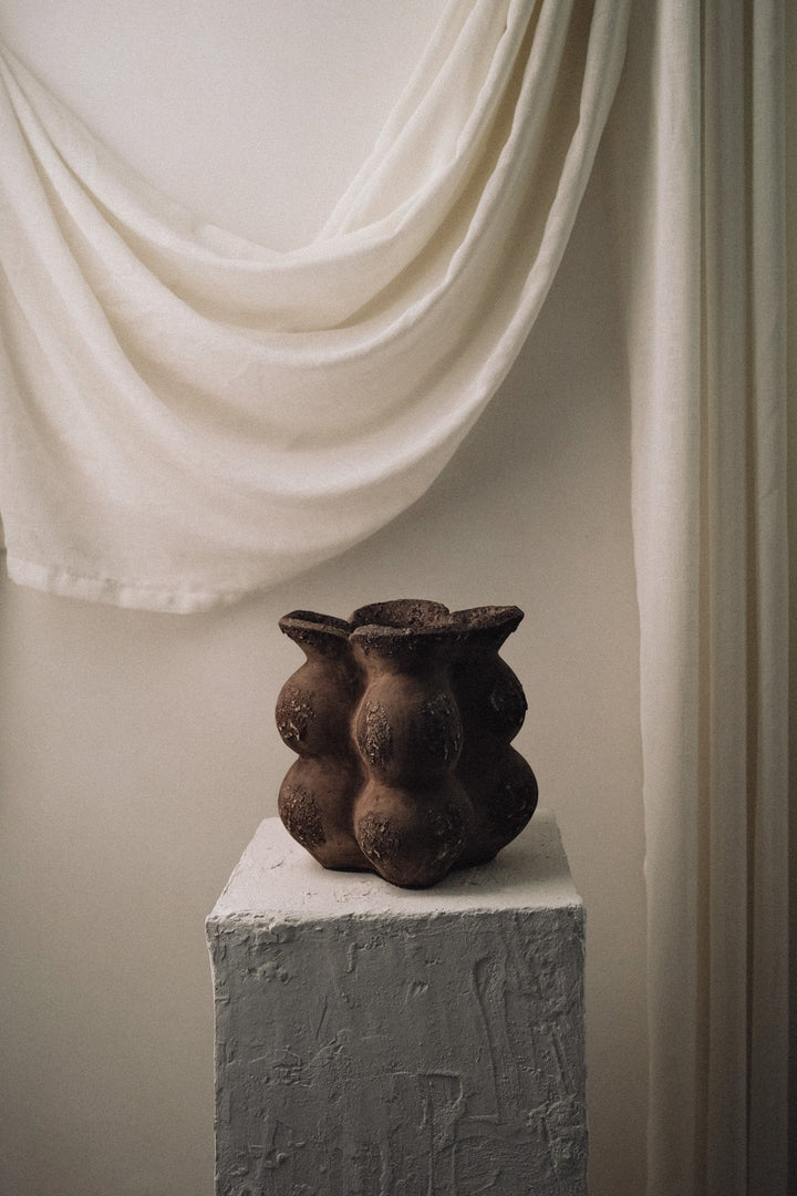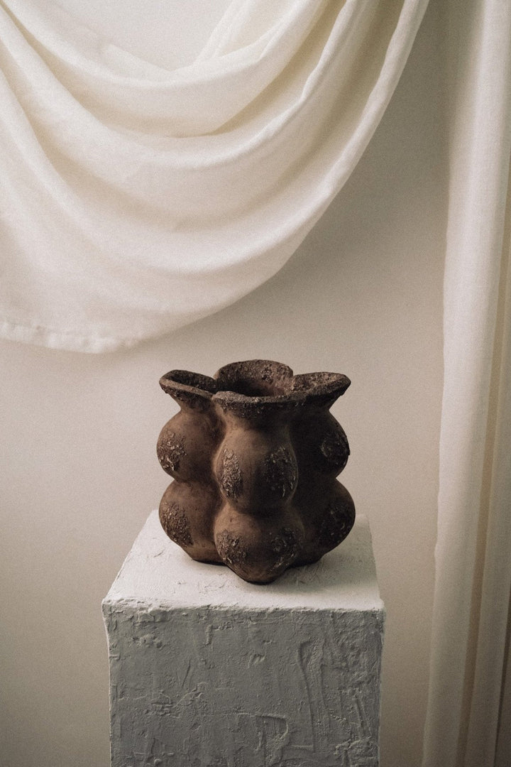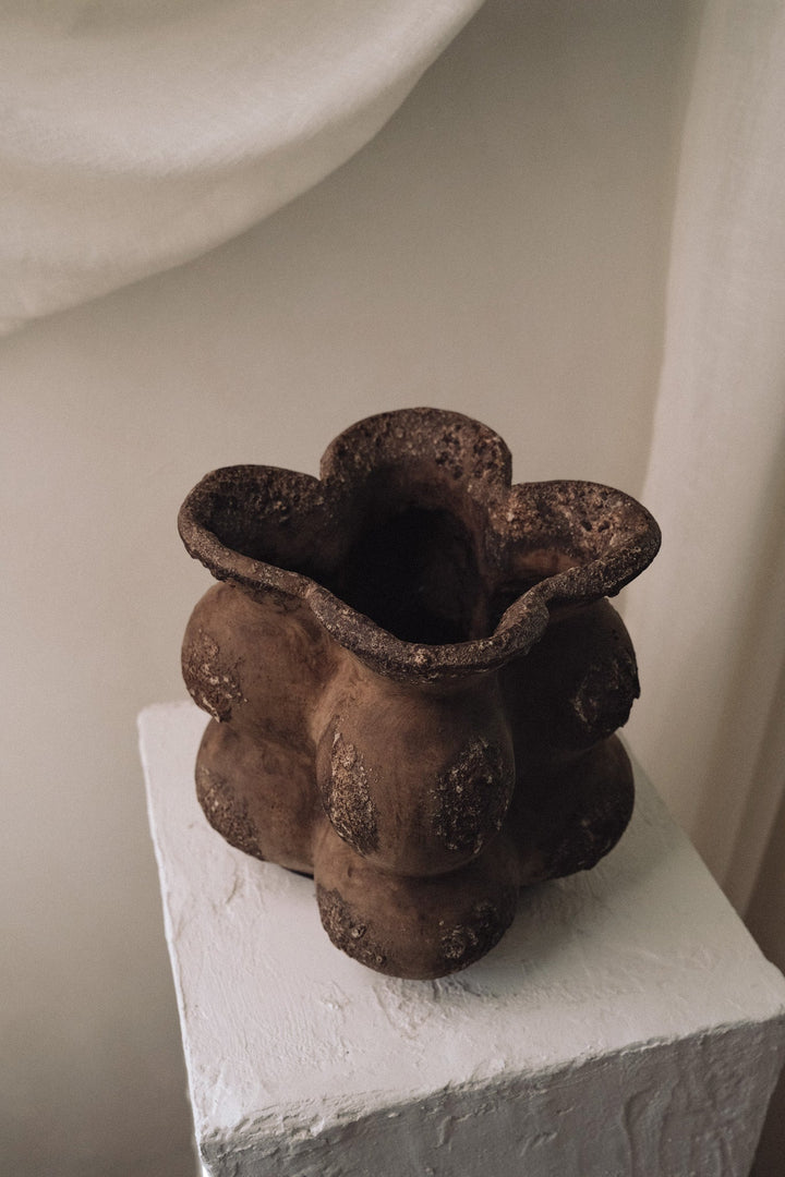 The rich brown tones, combined with its sculptural shape, create a grounding presence, adding depth and visual intrigue to any space. Whether displayed as an artistic statement or used to hold dried botanicals, this vessel is perfect for those looking to infuse their home with character, texture, and a connection to nature.