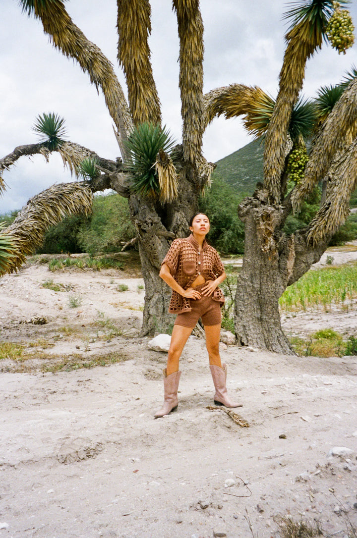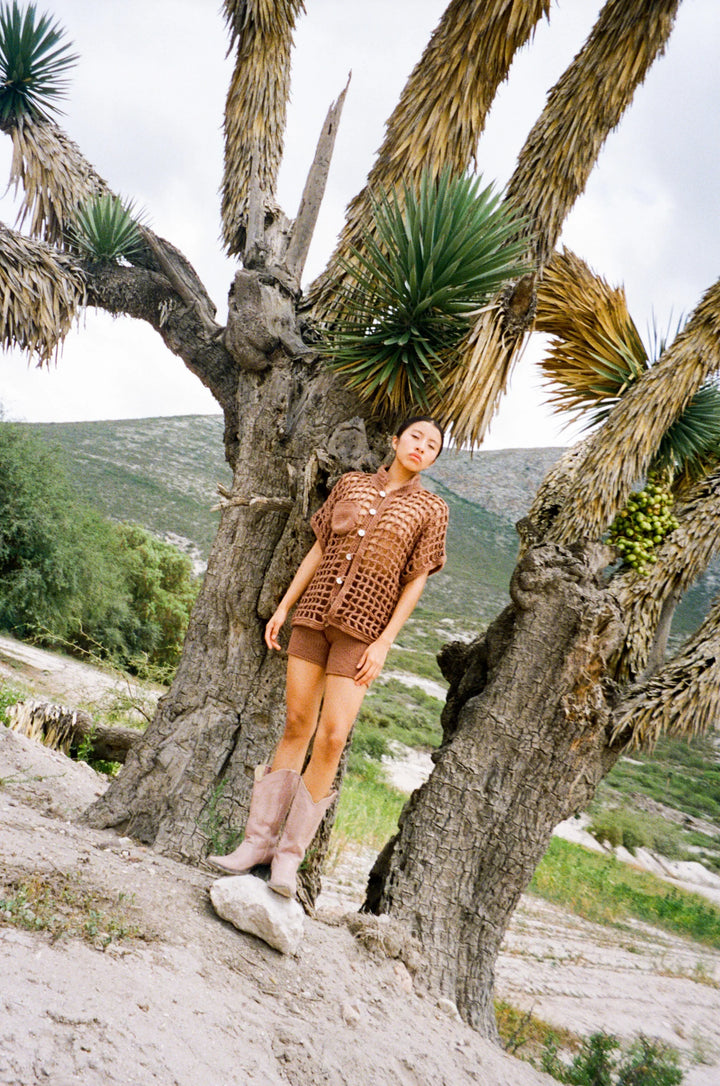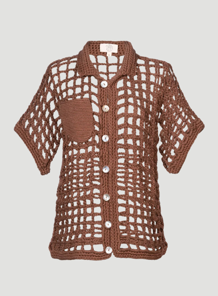 the nia thomas sessa shirt is the shirt your partner is going to keep stealing from your closet. this unisex 100% thick soft cotton button up shirt has a luxurious weight and a functional patch pocket with mother of pearl shell buttons. hand crocheted by peruvian women whose families have been passing this craft down for generations.