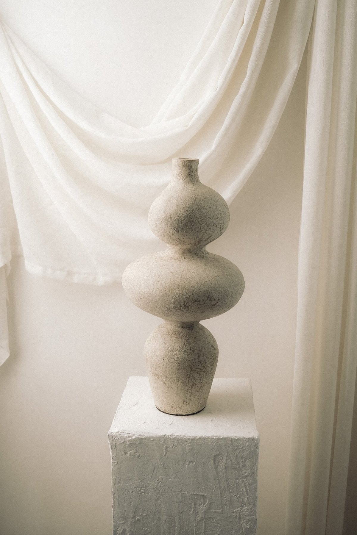 The Sewu vessel is a mesmerizing terracotta sculpture handmade by local Indonesian artisans. A more abstract take on sculptural shapes, this piece takes inspiration from the crown of the Sewu temple featuring curvaceous layers that taper along the middle and at the top. Its striking shape color and textured vintage finish adds to its unique features. Use it as an eye-catching decorative vase for florals or as a standalone decorative piece that adds vivid contrast to both traditional and contemporary spaces.