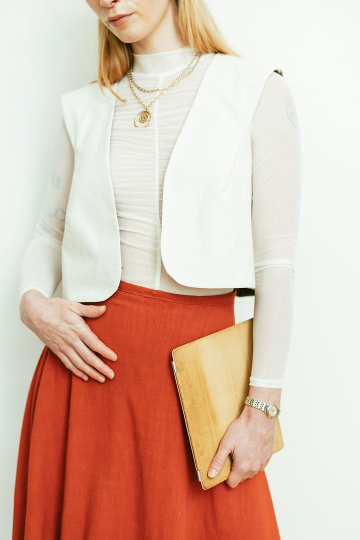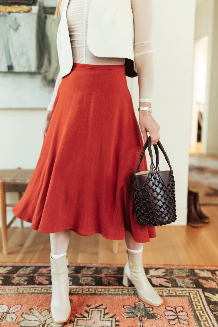 The Sara Skirt can be customized from colorway to fabric to hem length. Tatiana and Isa are wearing our One Size sampled in a mid-weight textured viscose linen.