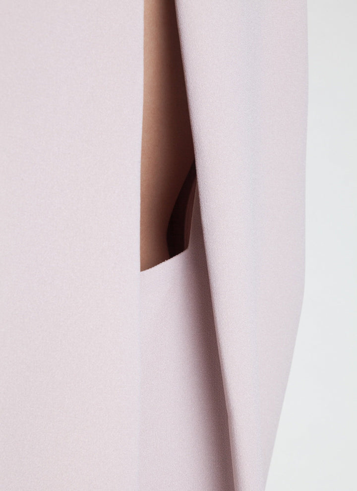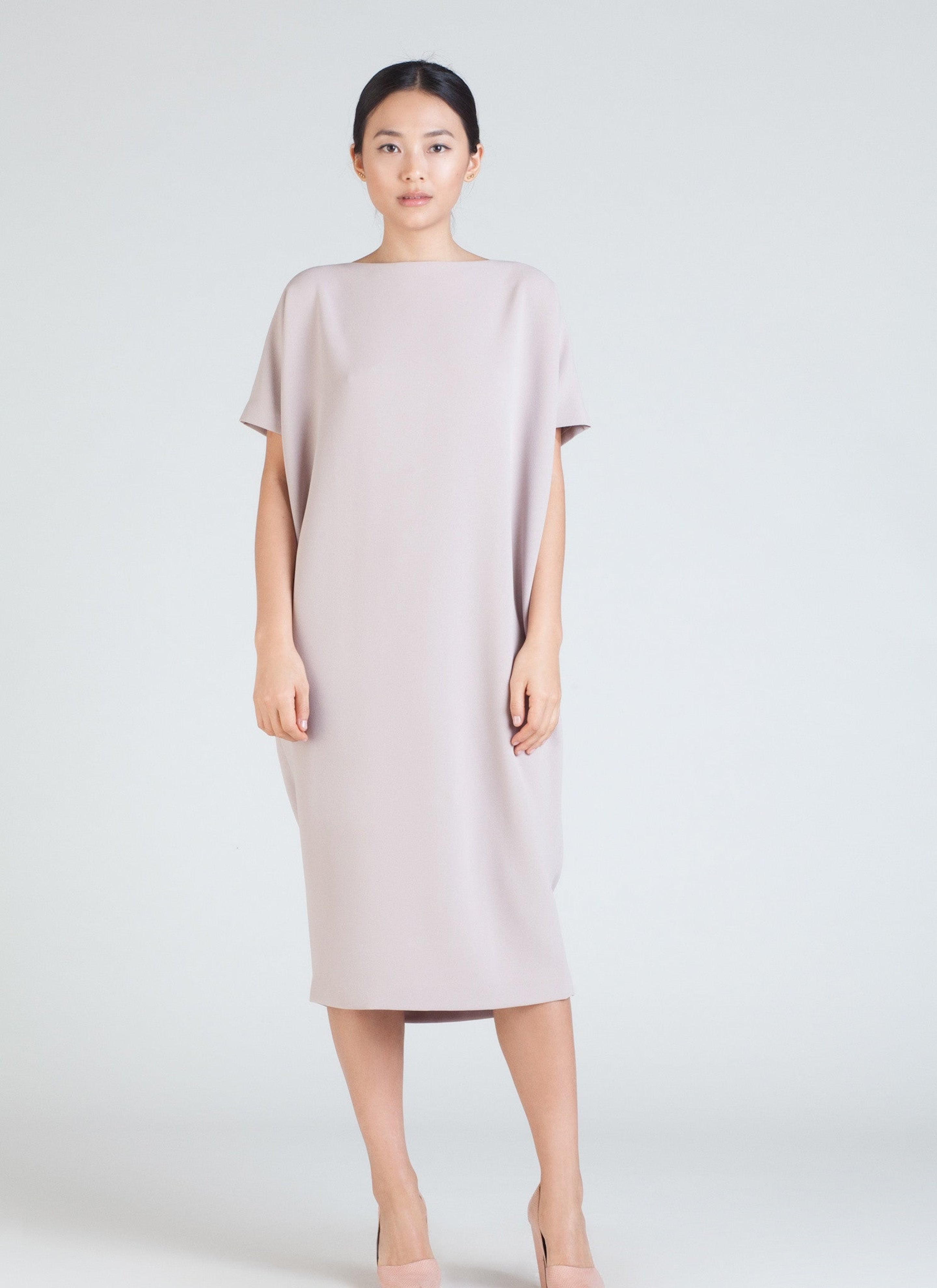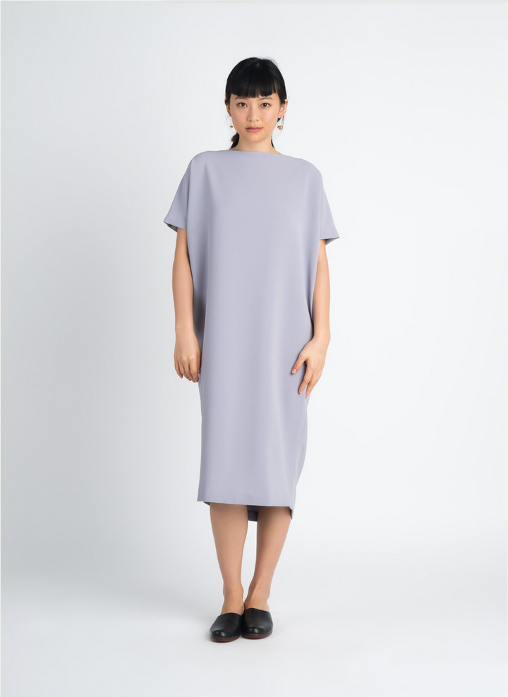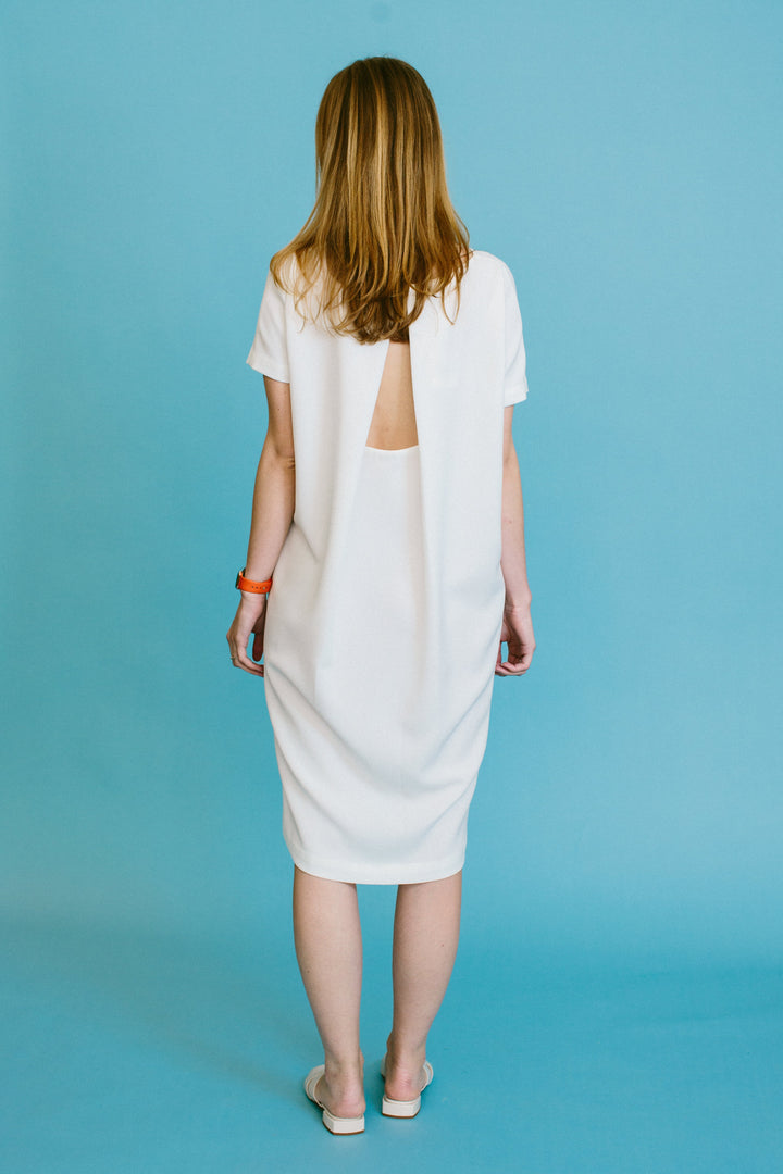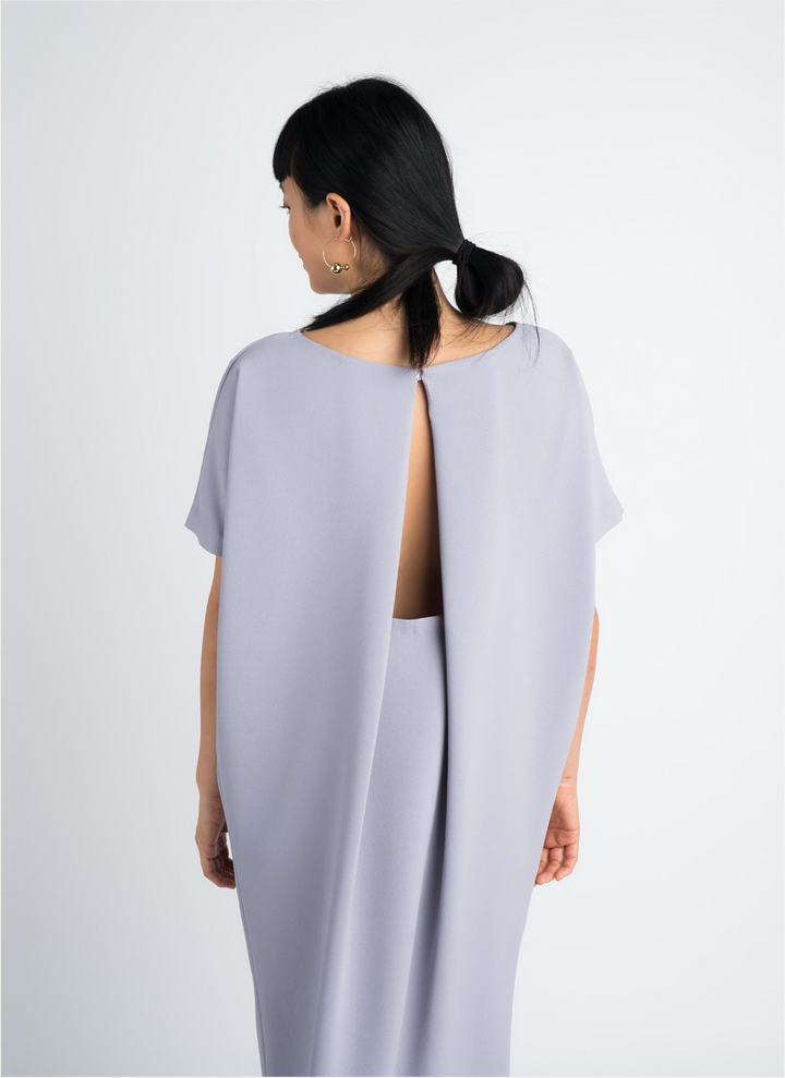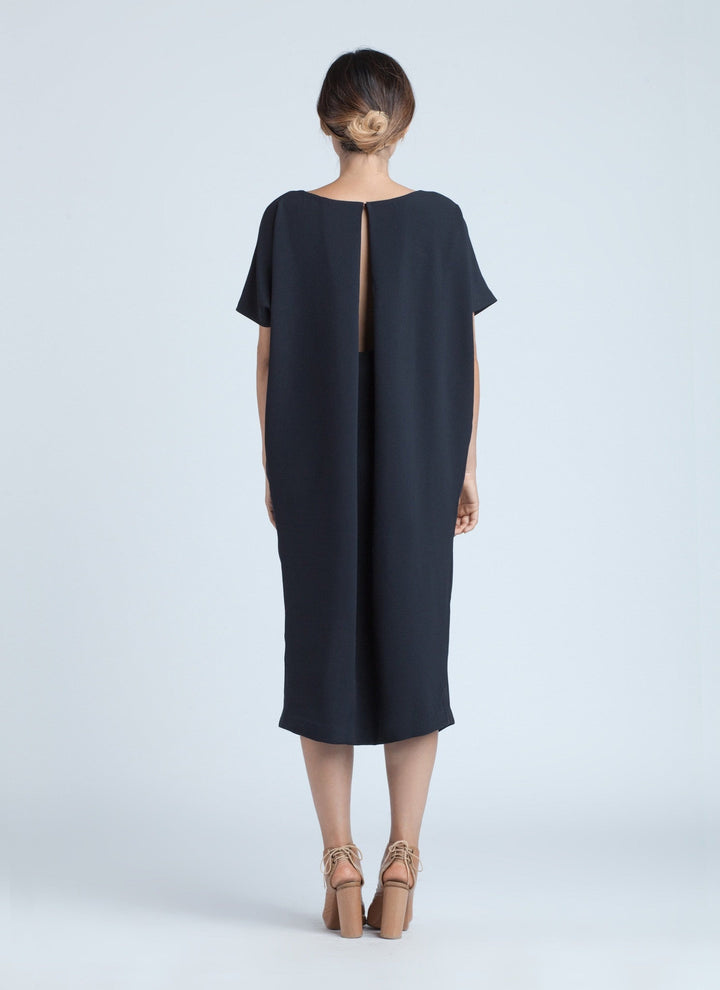 BEST SELLER! the kaarem triangle open back dress is a trademark midi-length style constructed with two pieces of fabric and a natural drape creating the open back detail. the dress features a hand braided button loop finished with a blind stitch.