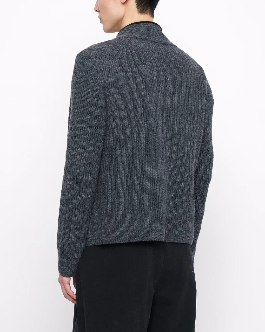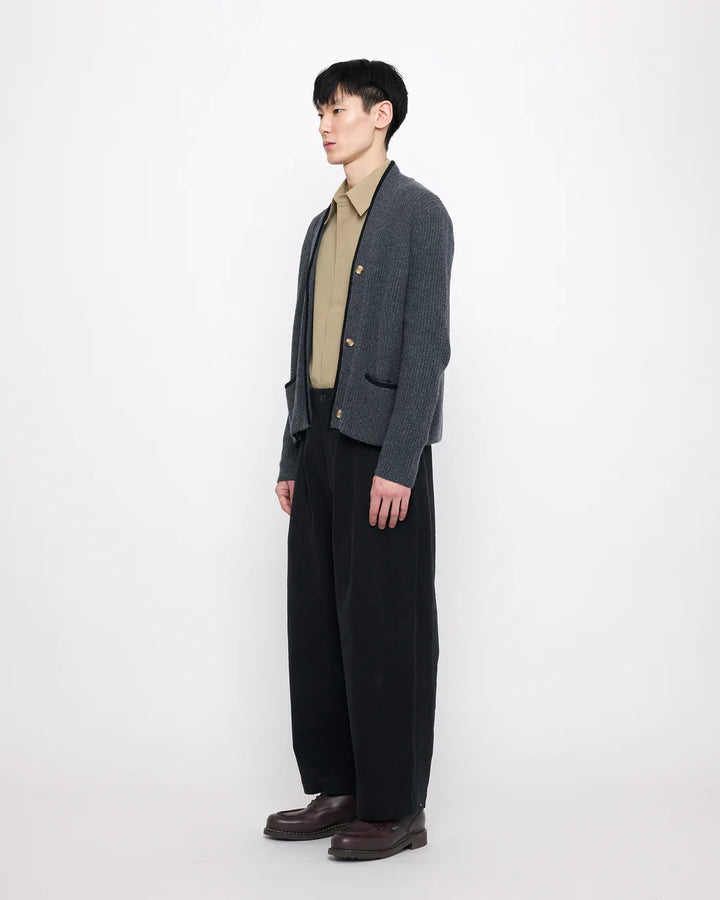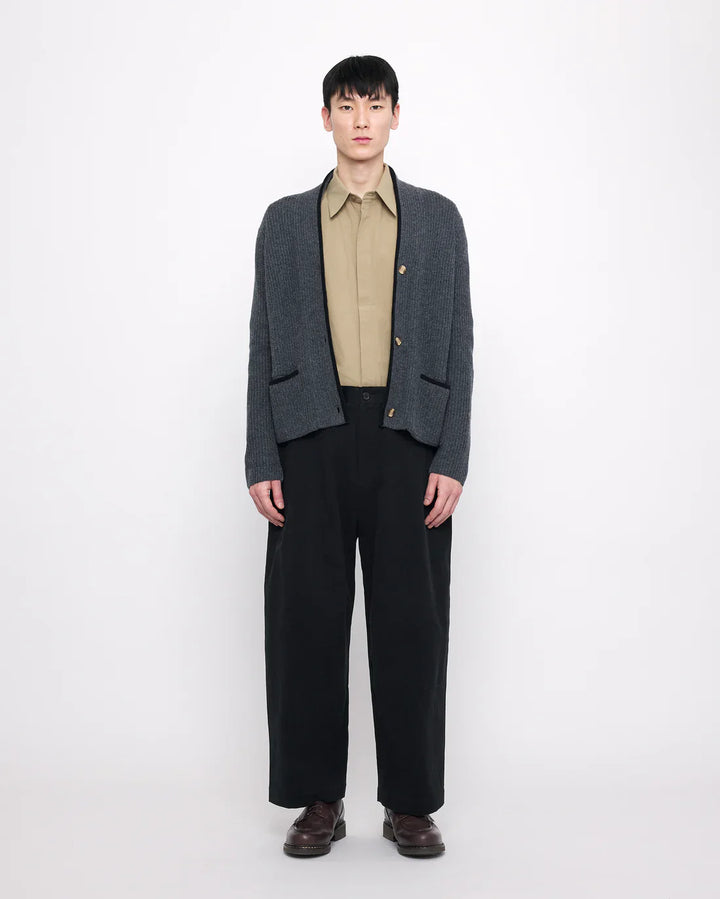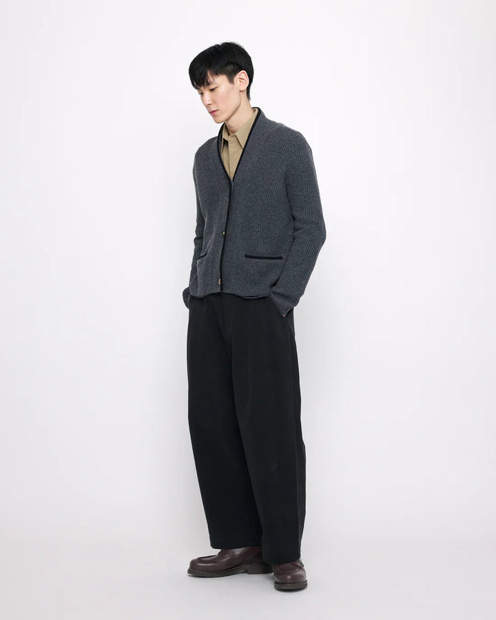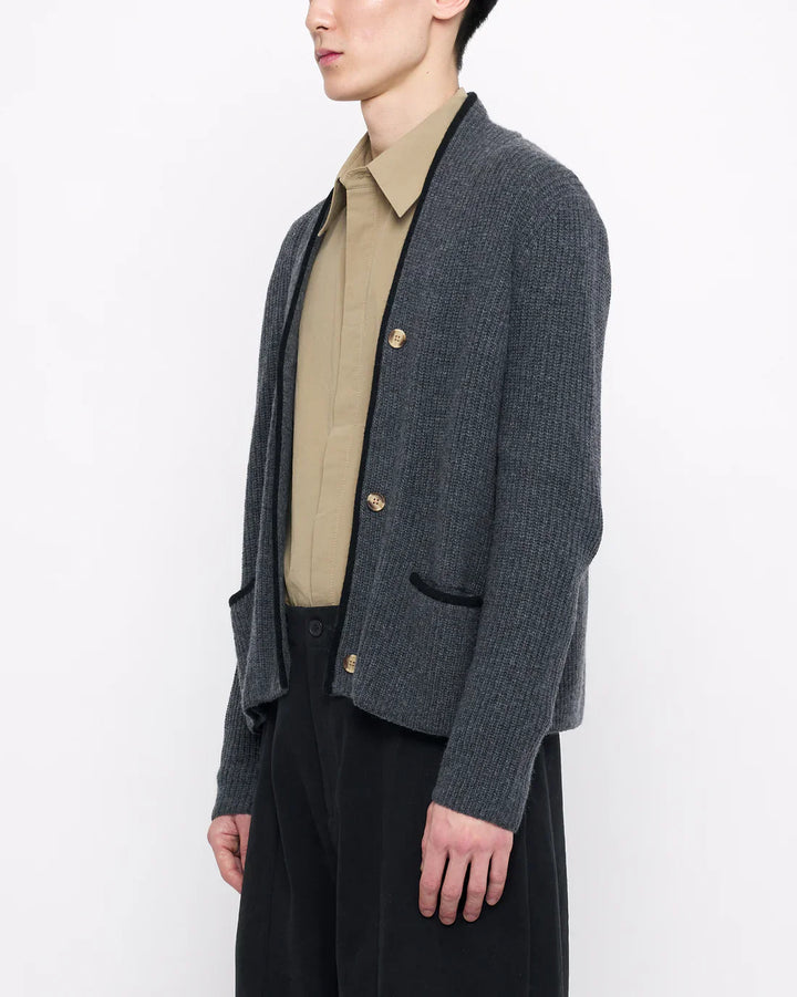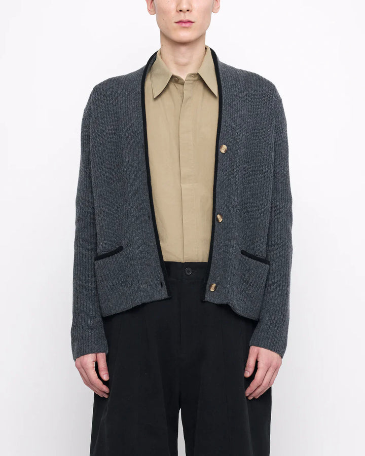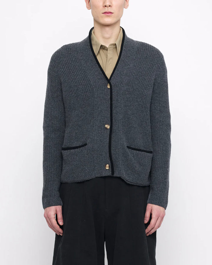 the v-neck pockets trimmed cardigan is 55% superfine merino, 20% organic cotton, 25% recycled nylon, and it runs true to size. we recommend gentle wash + lay flat to dry.